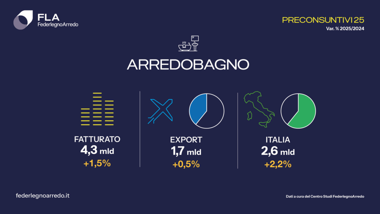 Il settore cucine chiude a 3 miliardi di euro (+0,5%), con mercato interno in crescita (+3,4%) ed export in calo (-5%). L’arredobagno raggiunge 4,3 miliardi (+1,5%), trainato dal mercato domestico (+2,2%) e da esportazioni sostanzialmente stabili (+0,5%).