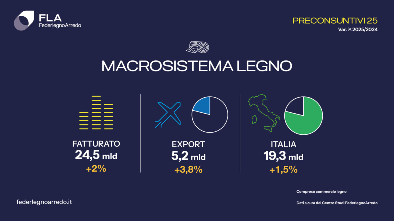 Giovedì 29 gennaio 2026, durante la conferenza stampa di presentazione della 64ª edizione del Salone del Mobile.Milano — in programma a Fiera Milano Rho dal 21 al 26 aprile — FederlegnoArredo ha diffuso i Preconsuntivi 2025 elaborati dal proprio Centro Studi. Il quadro, in un contesto macroeconomico ancora segnato da incertezza, è confortante; la filiera legno-arredo, infatti, mostra una tenuta superiore alle attese.
