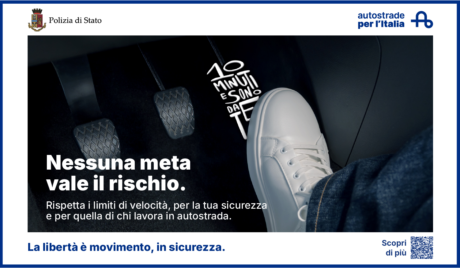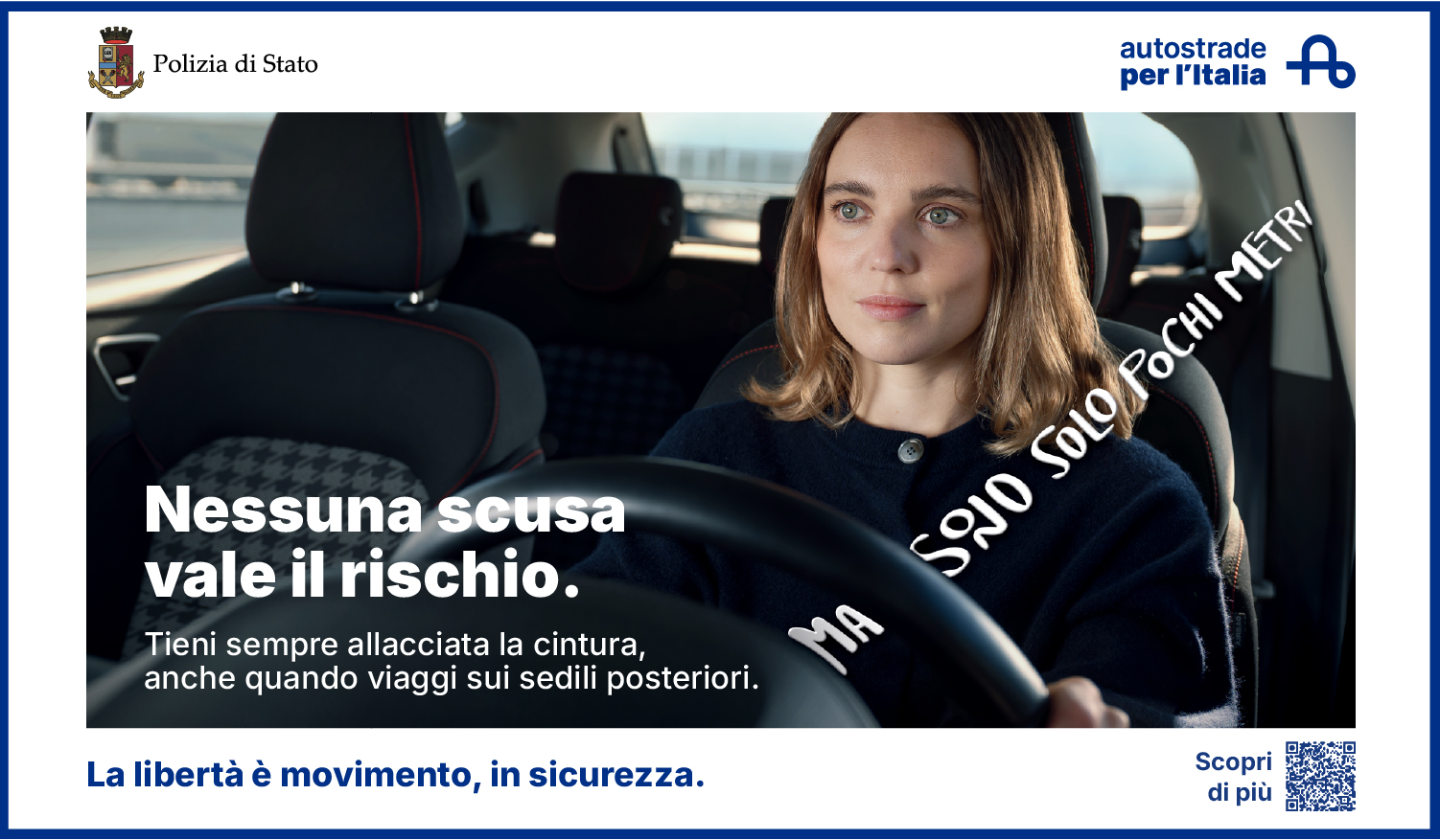 Attraverso un QR code, la campagna rimanda inoltre a una sezione dedicata su autostrade.it, con consigli utili per i comportamenti di guida corretti, approfondimenti sui principali fattori di rischio e contenuti sul tema della sicurezza stradale rivolti sia agli automobilisti sia agli autotrasportatori.