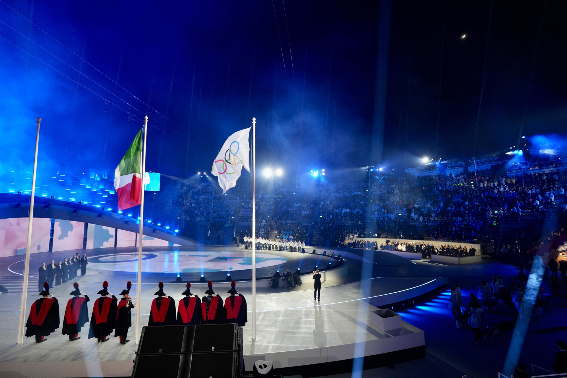 L’ingresso della bandiera italiana e dei medagliati azzurri è stato accompagnato dal “Canto degli Italiani”, introdotto dalla tromba del jazzista Paolo Fresu e interpretato dal Coro dell’Arena.