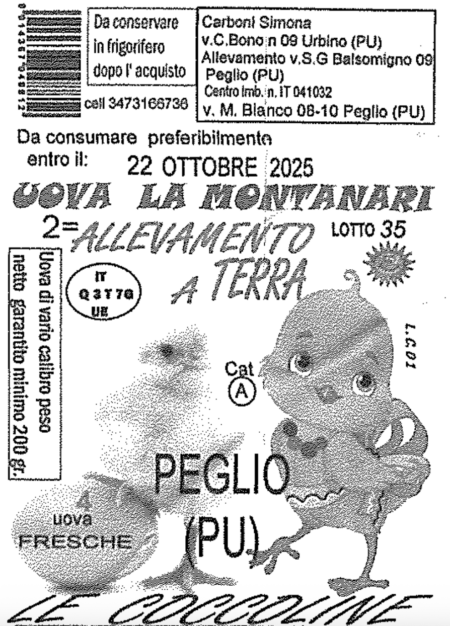 Nel dettaglio, parliamo del lotto numero 35 delle uova La Montanari, vendute in confezioni da 4 o 6 da 50 grammi al pezzo e contrassegnate dalla data di scadenza 22 ottobre 2025.