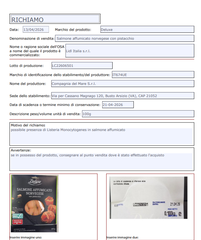 Nuovo richiamo alimentare segnalato dal Ministero della Salute per rischio microbiologico. Il provvedimento, pubblicato nella giornata di lunedì 13 aprile 2026, riguarda un lotto di salmone affumicato norvegese con pistacchio a marchio Deluxe, venduto nei supermercati Lidl.