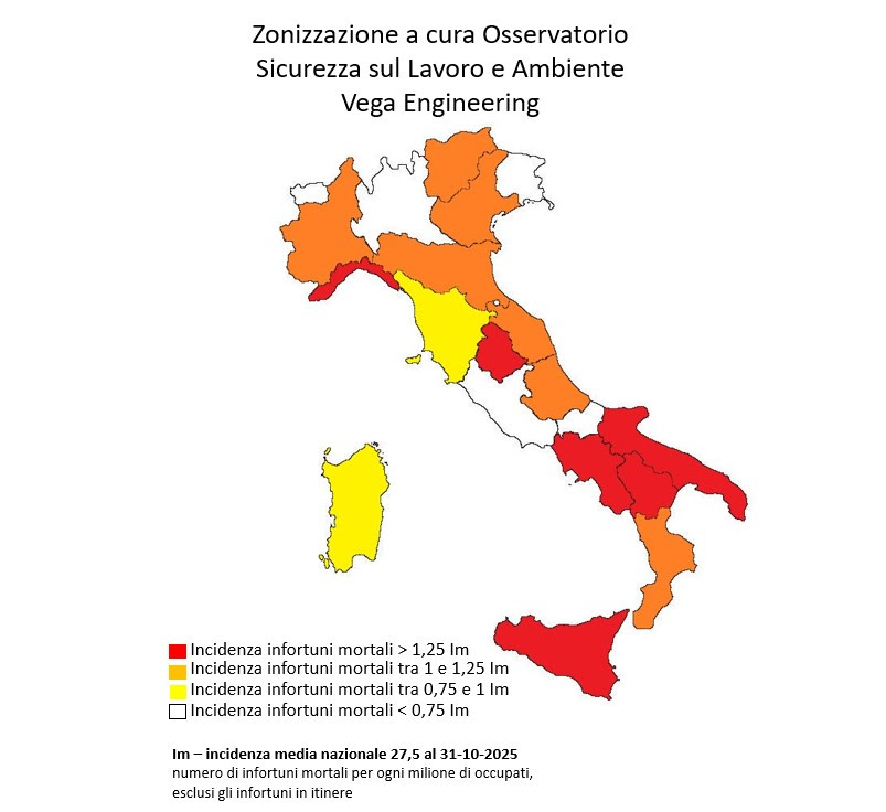 Le tragedie di queste ore si inseriscono in un quadro nazionale già allarmante. Secondo l’ultimo report dell’Osservatorio Vega, nei primi dieci mesi del 2025 si contano 896 vittime sul lavoro, 6 in più rispetto al 2024.