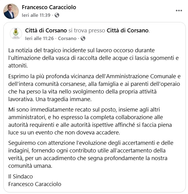 L’operaio, dipendente di un’impresa edile del suo paese, era al lavoro in un cantiere a Corsano nel basso Salento impegnato nella costruzione di una vasca di raccolta delle acque reflue commissionata al Comune.
