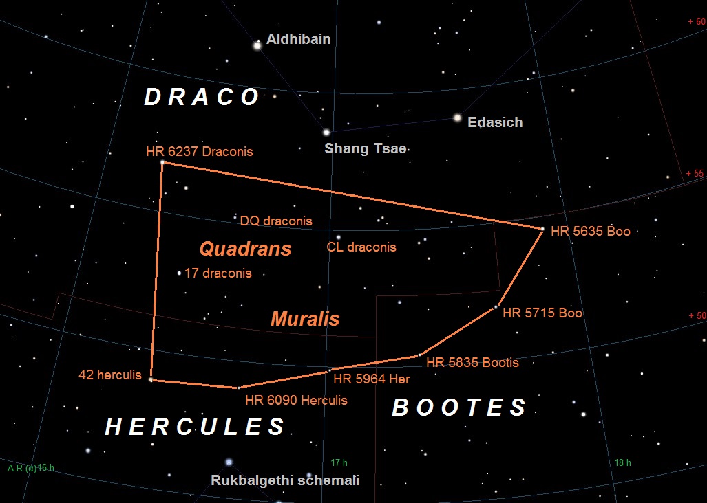 Il nome Quadrantidi deriva dalla costellazione oggi scomparsa Quadrans Muralis, introdotta nel 1795 dall’astronomo francese Jérôme Lalande. Nel 1922, con la standardizzazione delle costellazioni moderne, Quadrans Muralis fu eliminata e inglobata in gran parte nel Boote.