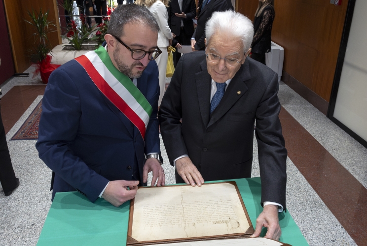 Il sindaco Pierluigi Biondi ha donato al Presidente Mattarella una riproduzione anastatica della Bolla del Perdono emanata da Papa Celestino V, simbolo della storia e dell’identità culturale della città.