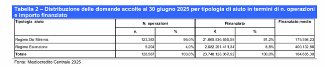 Rispetto al totale dei finanziamenti accolti nel 2025 (23,7 mld), il 96,0% (21,7 mld) è stato garantito sul regime De Minimis con un finanziato medio pari a 175,6 mila, il 4,0% (2,0 mld) a valere sul regime di Esenzione con un finanziato medio pari a 400,1 mila.