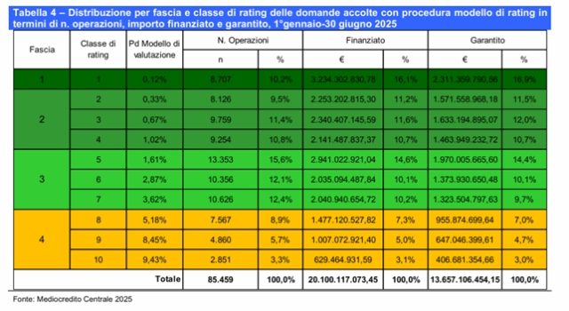 I finanziamenti accolti nel primo semestre 2025 risultano, pari a 23,7 mld e segnano una crescita del 15,1% sull’anno precedente (20,6 mld nel 2024) mentre l’importo garantito è pari a 16,6 mld, con una crescita del 16,4% sul 2024 (14,2 mld nel 2024) anche in presenza della rimodulazione al ribasso, a decorrere dal 1° gennaio 2025, della percentuale garantita, pari al 50%, per esigenze di liquidità (nel 2024 pari al 60% per imprese in fascia di rating 3 e 4 e pari al 55% per imprese in fascia di rating 1 e 2). Nel 2025 si registra un importo del finanziamento medio, pari a 184,7 mila, +2,9% sul 2024 (179,4 mila).