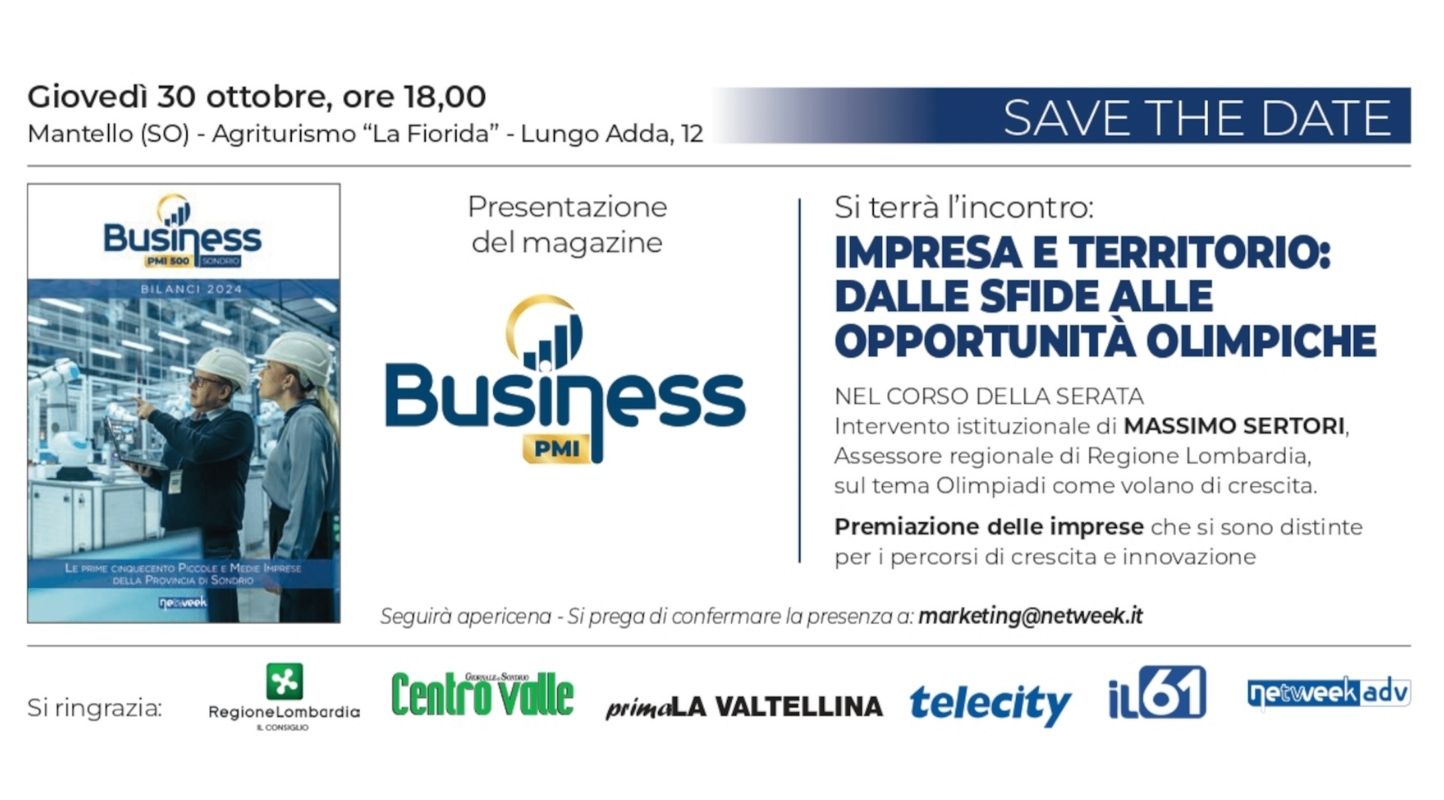 Un evento che nasce per valorizzare le eccellenze locali e affrontare i temi più attuali legati alla crescita e alla sostenibilità delle PMI, in un momento storico in cui le Olimpiadi Invernali 2026 rappresentano una grande opportunità di sviluppo per la Valtellina e per l’intera Lombardia.