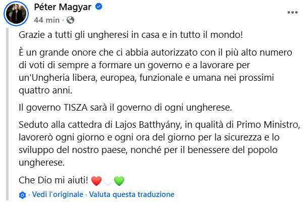 “Ce l’abbiamo fatta, Tisza e l’Ungheria hanno vinto le elezioni. Non con un piccolo margine, ma con un margine molto ampio. Insieme abbiamo liberato l’Ungheria“.