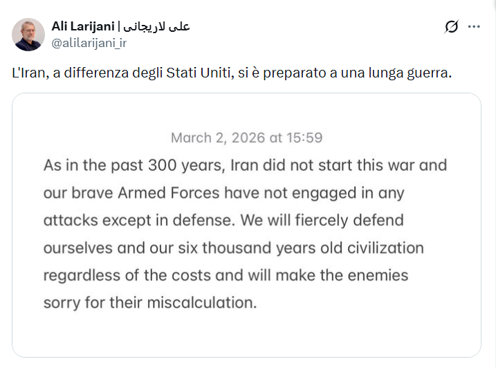 Il segretario del Consiglio Supremo per la Sicurezza Nazionale iraniano, Ali Larijani, ha affermato che l'Iran è pronto a resistere per una lunga guerra