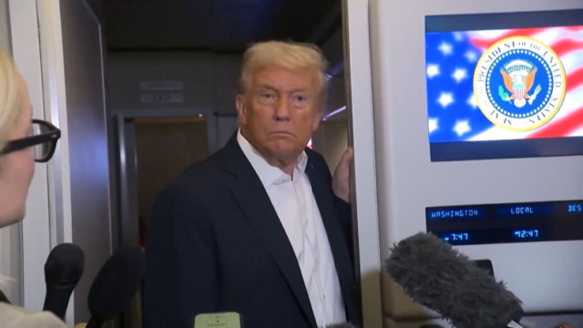 Trump mentre parla con i giornalisti sull’aereo