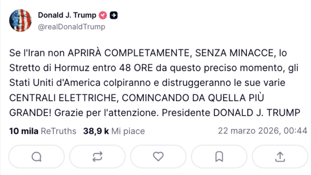 “Se non verrà aperto completamente e senza minacce entro 48 ore, colpiremo e distruggeremo le centrali energetiche iraniane”, ha scritto sul suo social Truth.