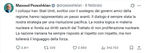In un messaggio pubblicato su X, Pezeshkian ha collegato la posizione iraniana ai diritti previsti dal Trattato di non proliferazione nucleare (TNP):