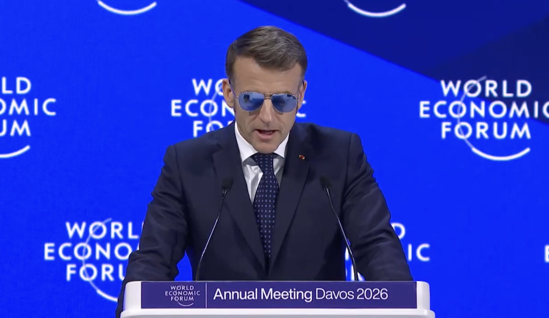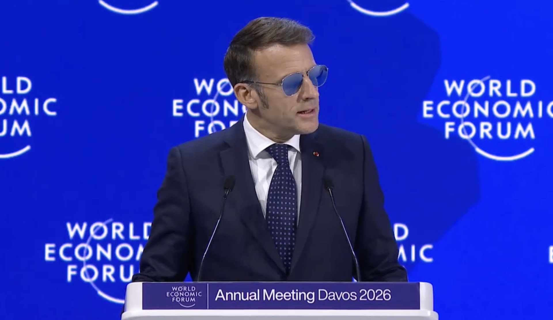 Con gli occhiali da sole specchiati, indossati a causa di un piccolo e “completamente innocuo” disturbo agli occhi, Macron apre il suo intervento con una battuta che strappa qualche risata in sala: