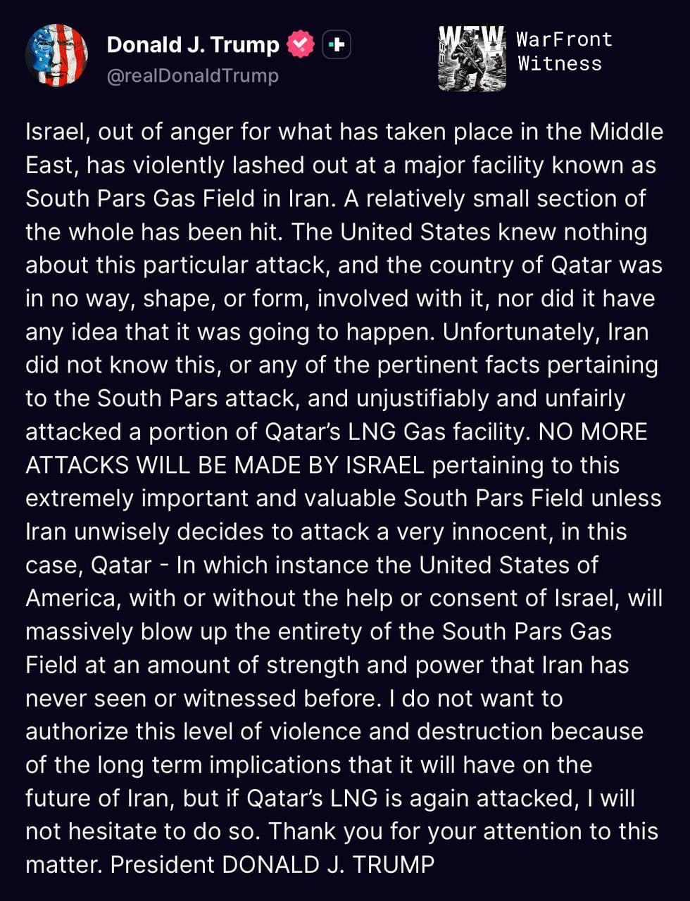 “Se l’Iran dovesse attaccare il Qatar, gli Stati Uniti potrebbero colpire direttamente l’intero giacimento di South Pars, anche senza il consenso israeliano”.