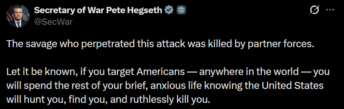Parole durissime anche dal segretario alla Difesa Pete Hegseth, che ha confermato la morte dell’attentatore.