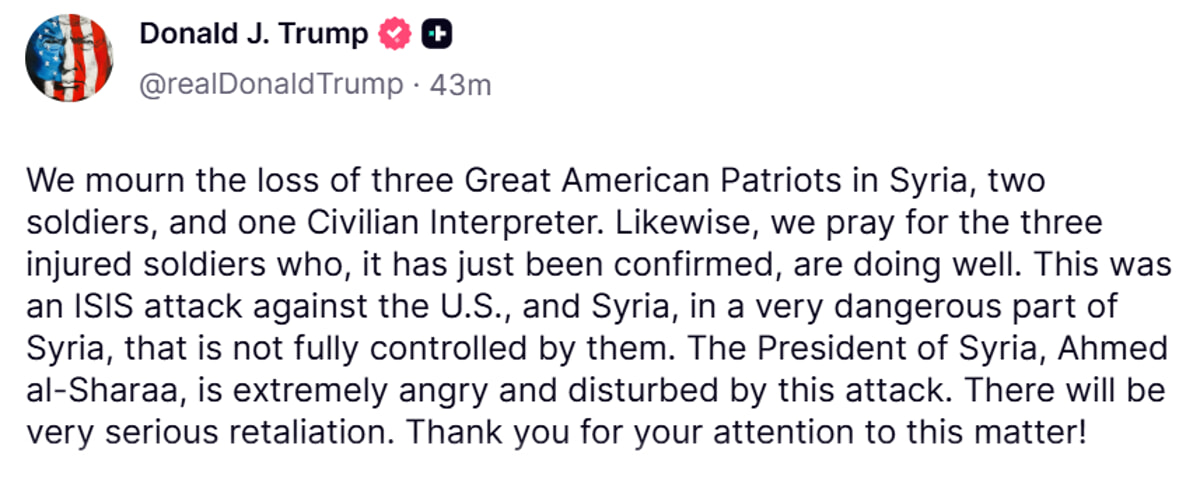 “Ci vendicheremo”, ha scritto Trump, aggiungendo che l’attacco è avvenuto “in una zona molto pericolosa della Siria, non completamente sotto controllo”.