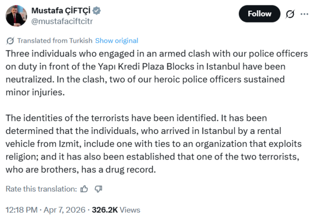 Saldırganların etkisiz hale getirildiği anlar ortaya çıktı pic.twitter.com/UJJiPS8zPk— Cumhuriyet (@cumhuriyetgzt) April 7, 2026