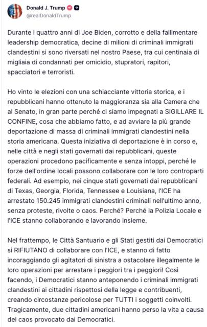 Da qui la richiesta di porre fine alle politiche che tutelano i migranti irregolari. Il presidente ha inoltre collegato l’intensificazione dei controlli sull’immigrazione a un presunto maxi scandalo di frode al welfare che coinvolgerebbe immigrati somali in Minnesota.