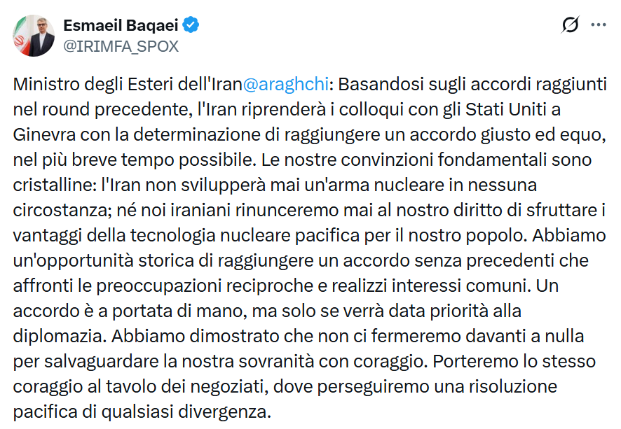 Mentre la delegazione iraniana cerca di mantenere una linea di dialogo costruttivo, il presidente iraniano Masoud Pezeshkian ha ribadito in più occasioni che Teheran non ha alcuna intenzione di sviluppare armi nucleari.