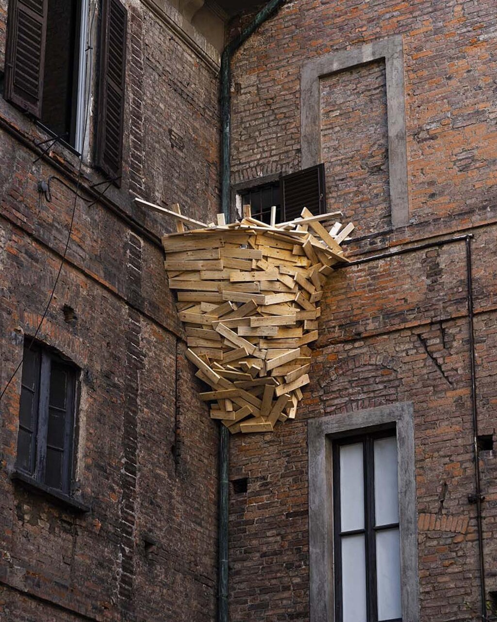 Come riporta Prima Milano cataste di legno, assi con pezzetti più o meno grandi inchiodati gli uni agli altri, sono comparsi ammucchiati a formare dei nidi in alcune vie della metropoli milanese: una particolare impalcatura in legno, il cui scopo non era affatto chiaro, è comparsa in via Monte di Pietà proprio sulla facciata del palazzo che al piano terra ospita la galleria Building.