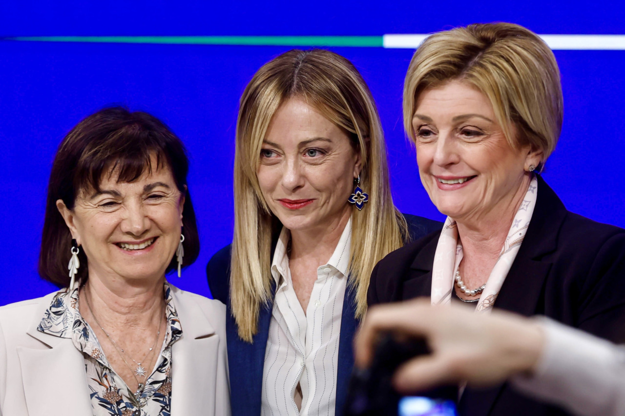 La presidente del Consiglio Giorgia Meloni, con la ministra del Lavoro Marina Calderone  e la ministra della Famiglia e Pari opportunità Eugenia Roccella