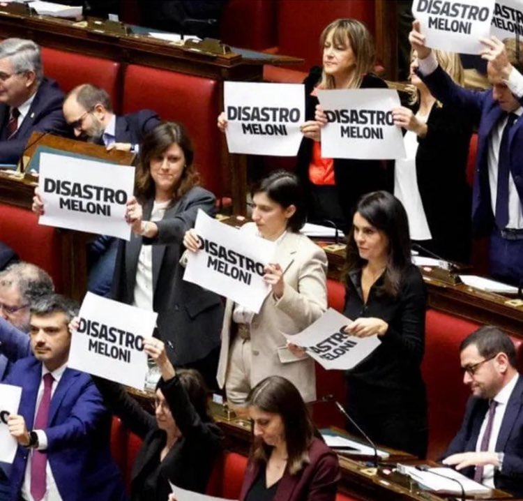 La protesta dell’opposizione con Elly Schlein a mostrare il cartello “Disastro Meloni”