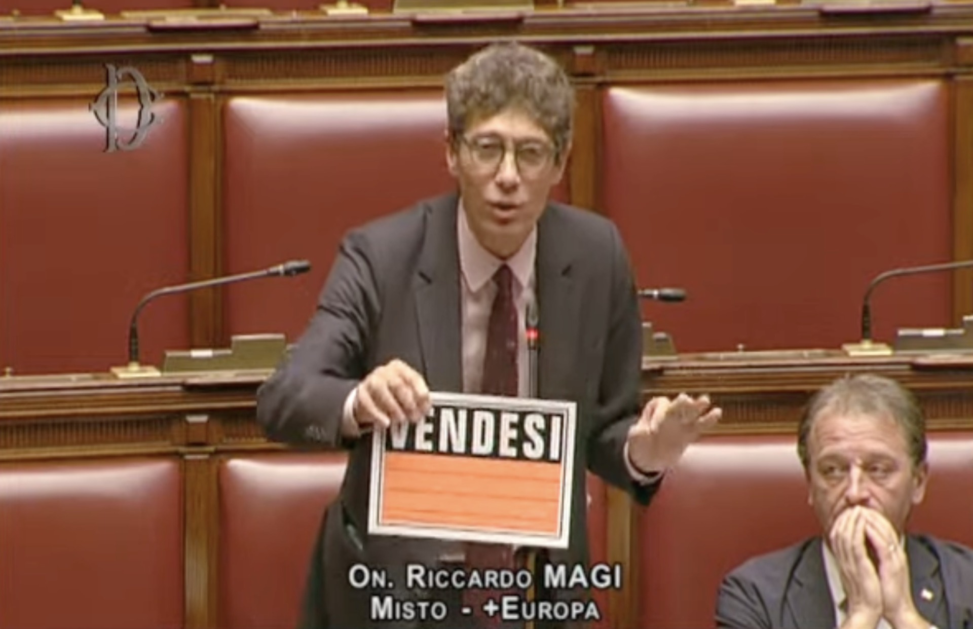 Riccardo Magi espone il cartello “Vendesi” in Aula