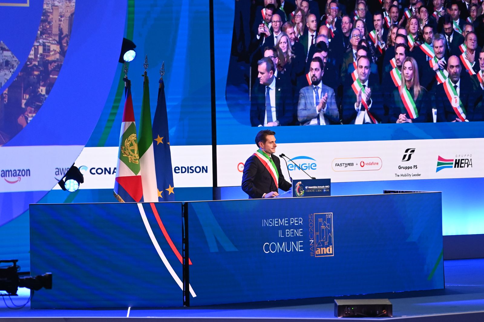 ’Insieme per il bene comune’ è il claim scelto per questa 42° Assemblea: è proprio grazie a ciascuno di voi amministratori se l’Anci è in grado di svolgere il fondamentale ruolo di cerniera tra i Comuni e le istituzioni nazionali, interpretando le istanze dei nostri territori e trasmettendole agli esponenti del Governo. È attraverso il vostro sguardo, la vostra passione e la vostra esperienza che l’Associazione costruisce – giorno dopo giorno – la propria azione di rappresentanza”.