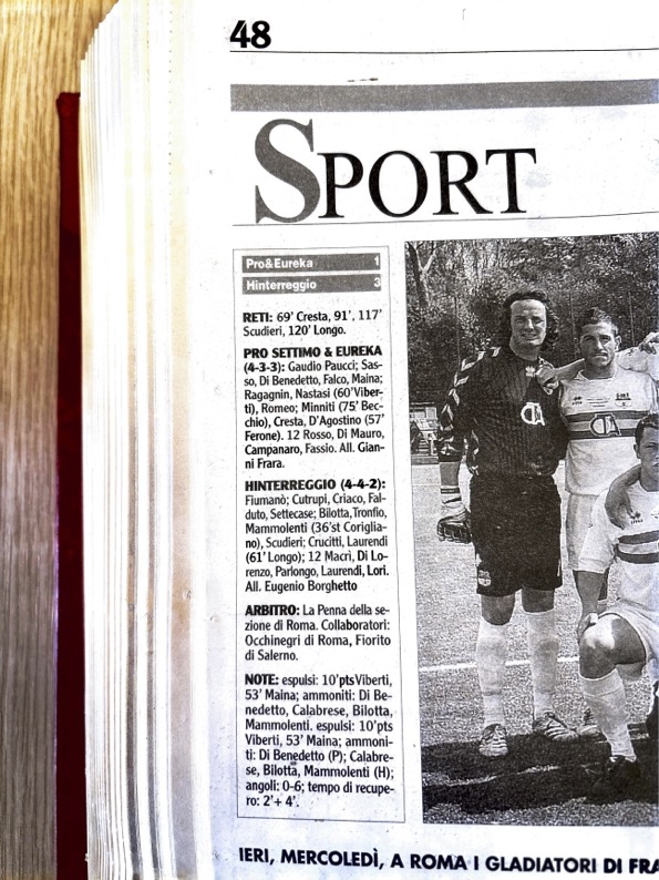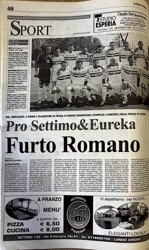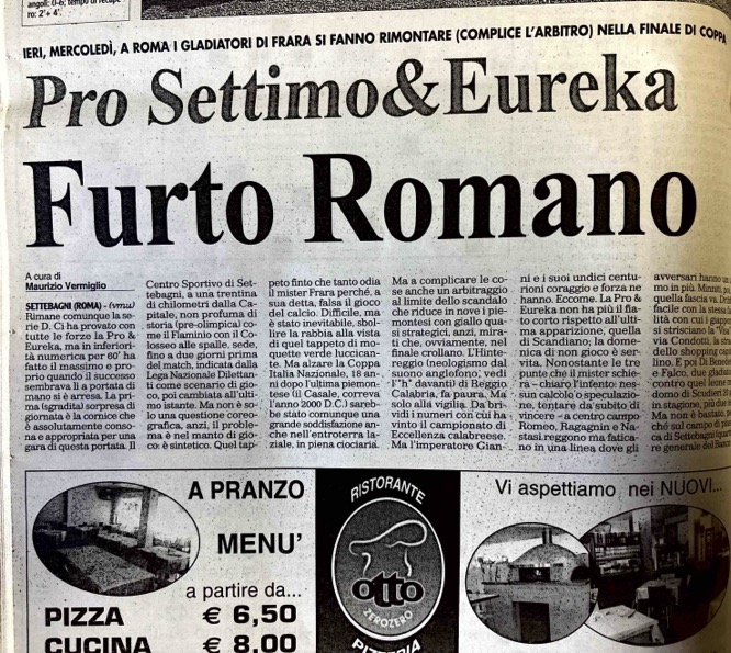 “La Pro Settimo & Eureka spogliata di un sogno da una direzione che all’epoca avevo definito “chirurgica” nel ridurre in nove uomini con cartellini gialli quasi strategici. Scrissi che fu un “furto romano”, a caratteri cubitali nel titolo; ripreso anche in prima pagina”.