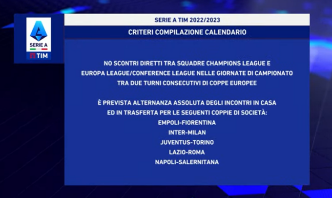 Oggi, venerdì 24 giugno 2022, si sono svolti i sorteggi del prossimo campionato di Serie A 2022/2023. Ecco tutti gli accoppiamenti e i big match dalla prima alla 38esima giornata.