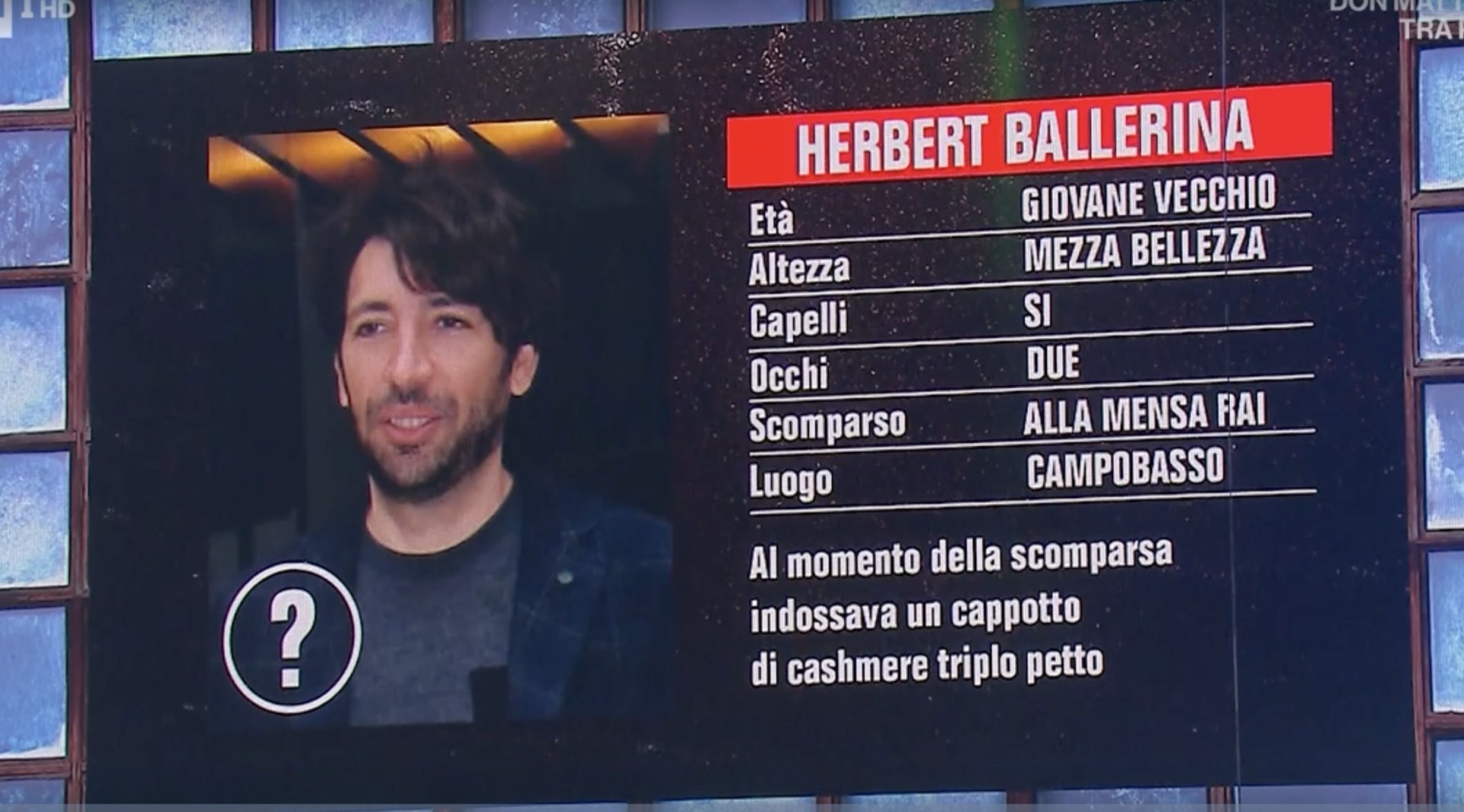 “Allora, amici Herbert, sapete che sono giorni che non si trova? Abbiamo qualche piccola segnalazione, alcune segnalazioni false anche sono arrivate in redazione. Stiamo facendo fatica a ritrovarlo. Stamattina qualcuno ha chiamato in redazione dicendo che è stato avvistato a bordo di un motoscafo in acque internazionali. Io non so, io non so, spero sia uno scambio di persone. Le ricerche sono avviate… Torna a breve, torna a breve“, ha concluso il siparietto ironico De Martino, lasciando trapelare il fatto che presto tornerà in trasmissione.