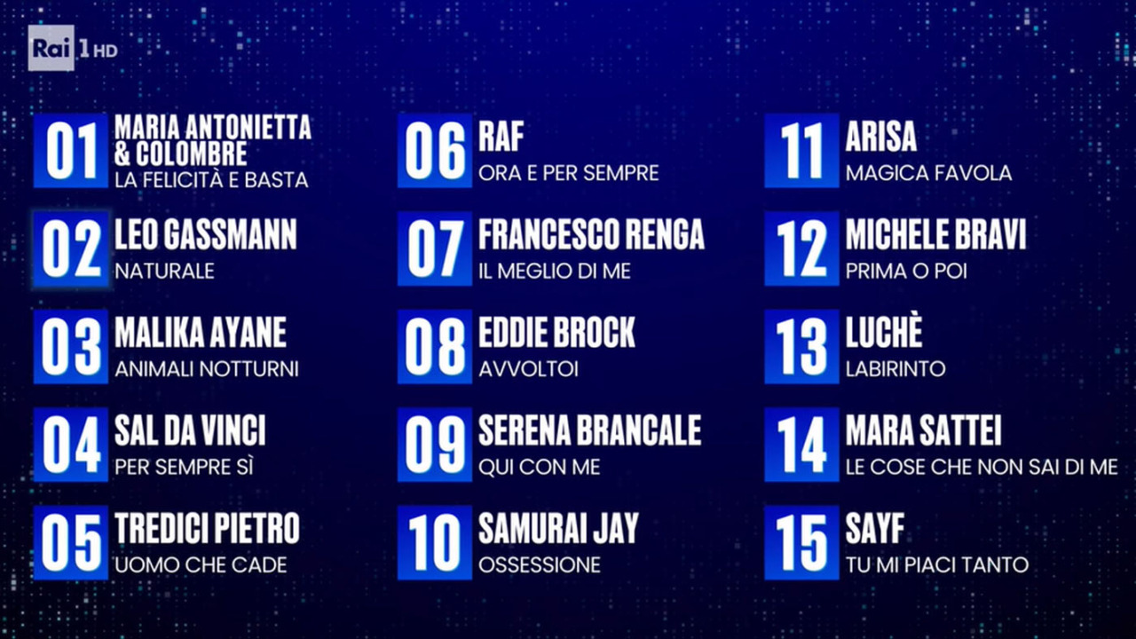 Sul palco l'altra metà dei cantanti. Co-conduttori Laura Pausini, Irina Shayk e Ubaldo Pantani (Lapo). Ospiti speciali Alicia Keys ed Eros Ramazzotti, in Piazza Colombo The Kolors, sulla nave Costa Toscana ancora Max Pezzali, ci saranno anche Fabio De Luigi e Virginia Raffaele