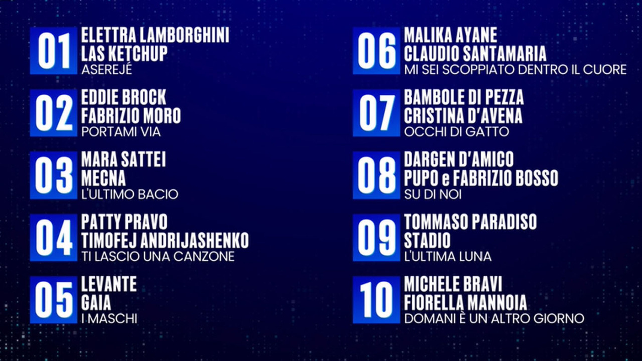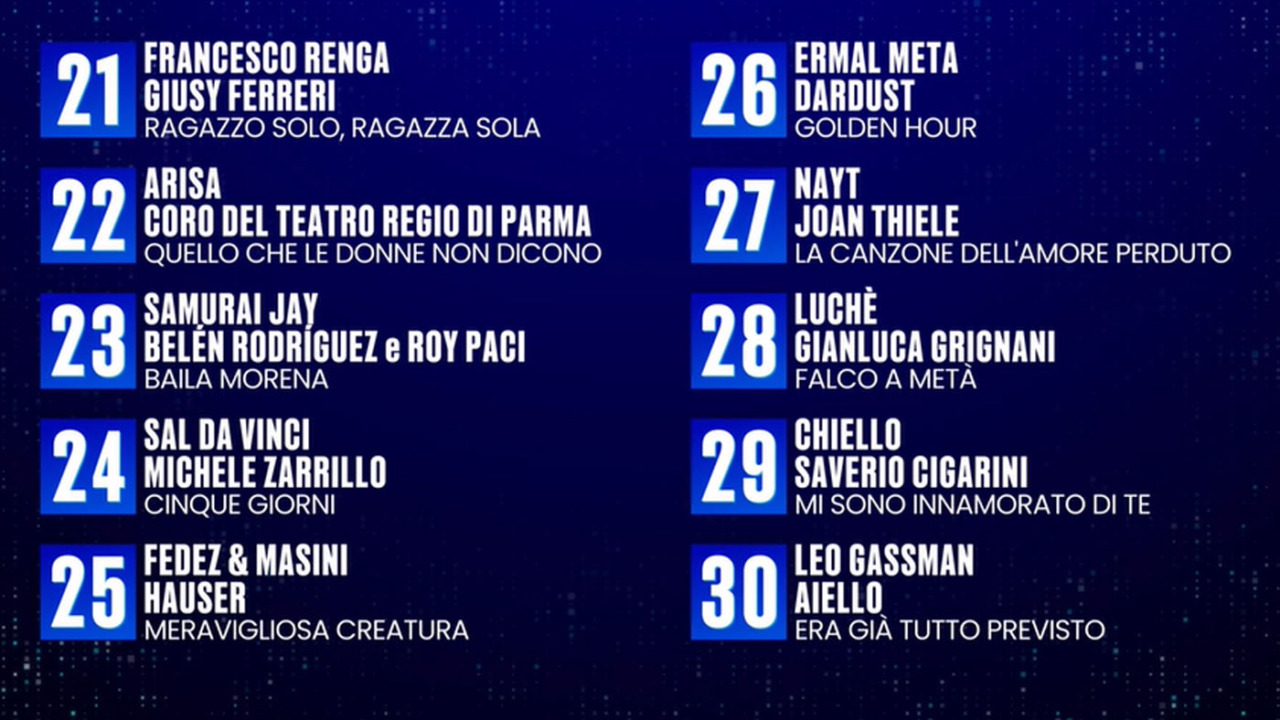 Arisa, serena Brancale e Fedez e Masini sono gli unici che ricorrono sia la prima sera che le successive e giocoforza hanno ottime possibilità di finire sul podio finale, ma non sappiamo quanti voti abbiano effettivamente preso, ad esempio, Sal Da Vinci o LDA & Aka 7even o Tommaso Paradiso.