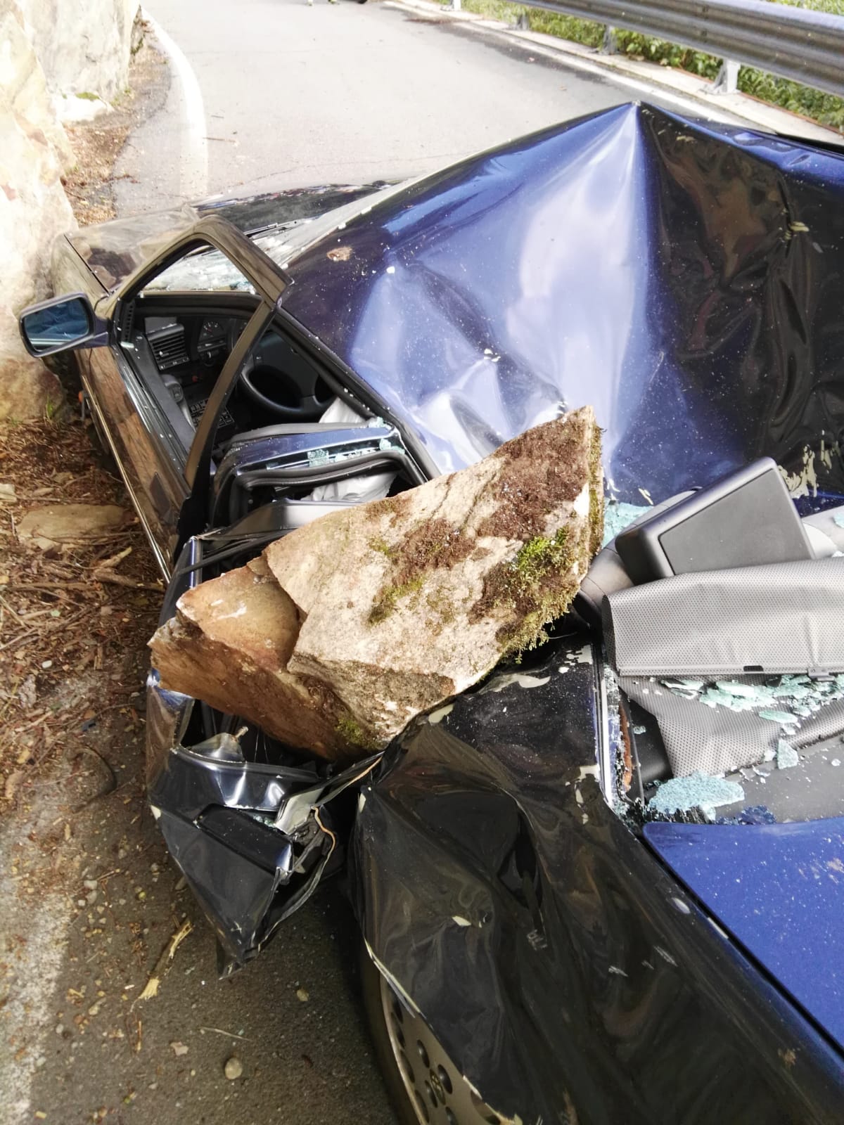 Un’immagine terrificante. La vecchia Alfa Romeo con l’abitacolo tutto accartocciato, quell’enorme masso, i soccorritori febbrilmente impegnati. E’ fortunatamente l’istantanea di una tragedia solo sfiorata, perché l’automobilista protagonista di questo incredibile episodio s’è salvato per miracolo: non solo il macigno che gli è piombato in testa l’ha sfiorato per pochi centimetri, poi è anche stato tratto in salvo da un carabiniere fuori servizio che è riuscito a disincastrarlo dalla lamiere contorte.